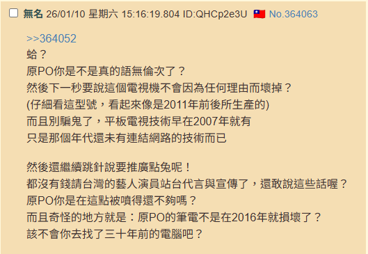無名氏: 我就不信說原po可以在精神大崩潰且如同失智症與躁鬱症發作下一天連開12個串 (1h83BvtE 26/01/12 08:58)
