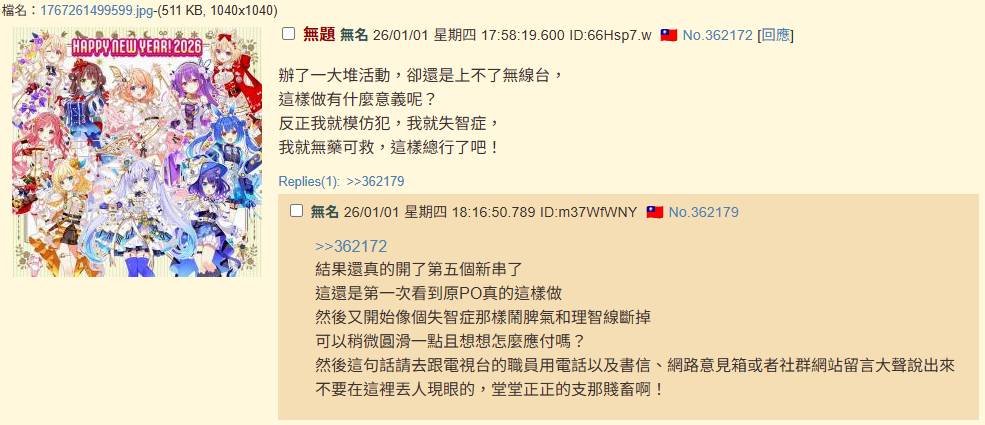 無名氏: 這還真誇張,今年元旦一整天從跨年午夜12點後至今連開了四個新串,不過我想看原PO是否有膽開第五個串 (anFZSZTA 26/01/01 17:47)